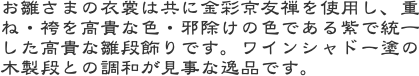 幾重にも着せ付けした豪華な衣裳。美しいお顔の十五人揃いは美しさの中にも気品が漂います。紫色の段掛には友禅に刺繍を施し輝きを添えています。