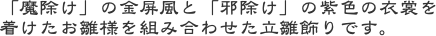 「魔除け」の金屏風と「邪除け」の紫色の衣裳を着けたお雛様を組み合わせた立雛飾りです。