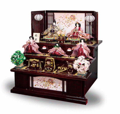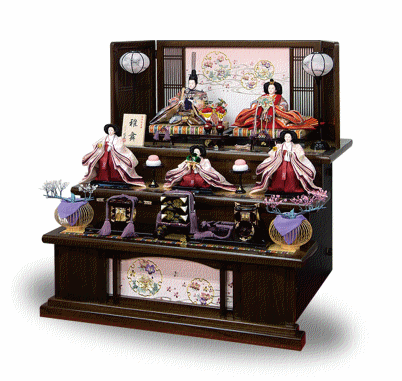 落ち着いたダークワインの塗りの屏風と段に厳選された桜柄の高級金襴を使用した五人飾りを組み合わせました。屏風の窓の桜の刺繍がとてもかわいい三段飾りです。